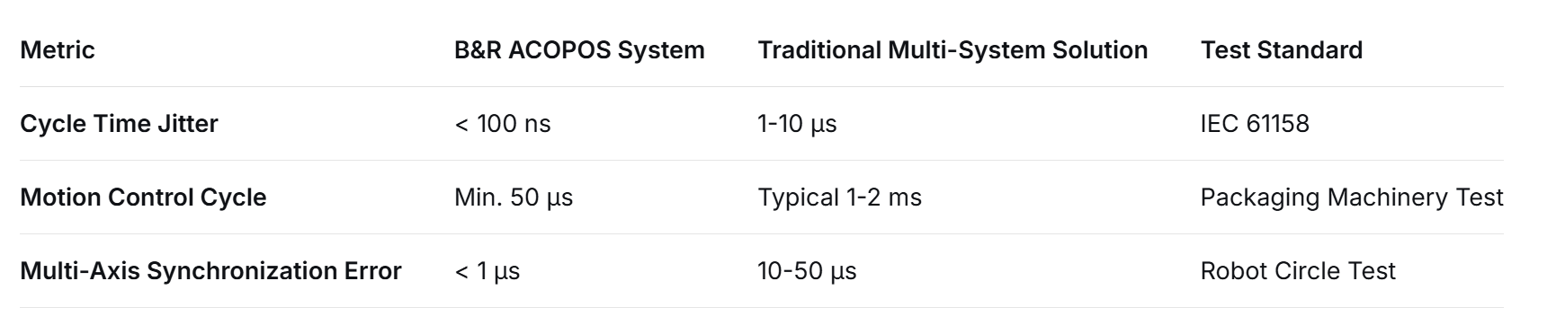 Performance Advantages are Quantifiable: B&R's technical superiority in synchronization accuracy (<1µs) and control cycle time (min. 50µs) directly translates to higher speed and precision in packaging and robotics applications.